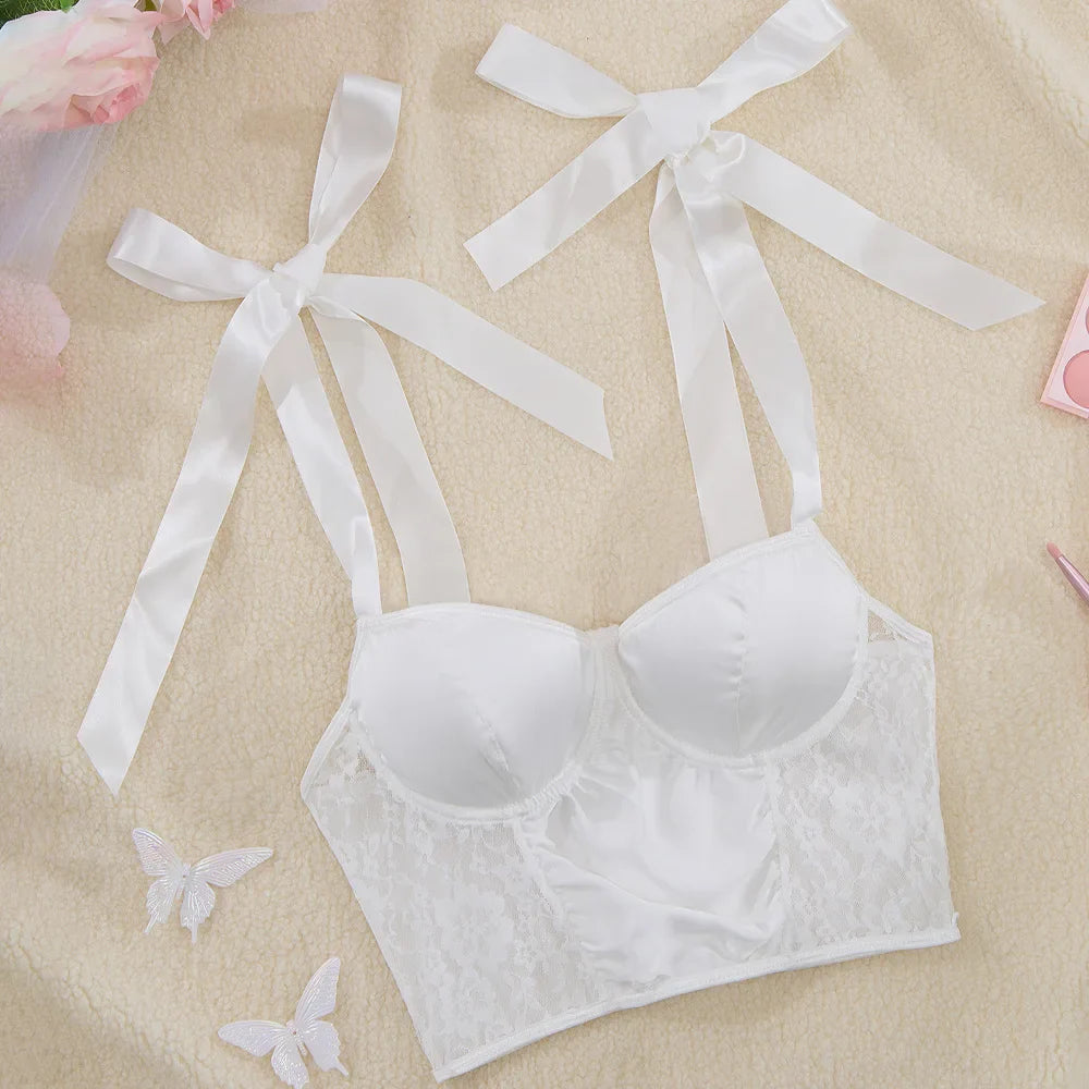 Bustier de satén blanco con sujetador acolchado. Top de lencería con tirantes de cinta y corpiño de encaje.