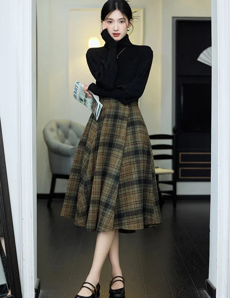 Elevate your dark academia look with our 2-piece plaid wool set! This set features a timeless and sophisticated plaid A-line skirt and a long sleeve turtleneck sweater. Perfect for any occasion. this set will keep you warm and stylish.