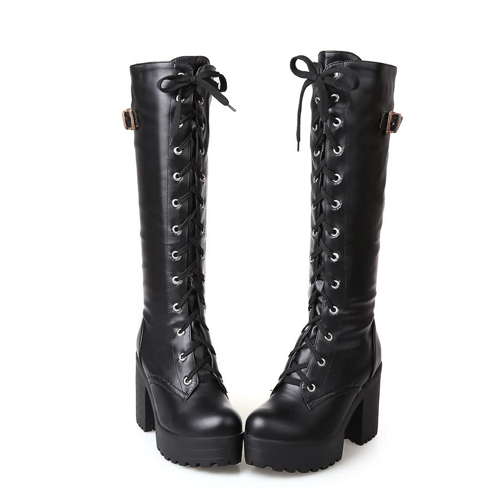 Elevate your style with our Black Gothic Punk Leather Lace Up Knee High Platform Boots. Crafted from durable vegan leather. these boots feature platform soles and sturdy block heels for added height and comfort. The adjustable lace-up front adds an edgy touch. perfect for those embracing a gothic. punk. rock. or alternative aesthetic. Step out in luxury and embrace your inner rebel with these statement boots.
