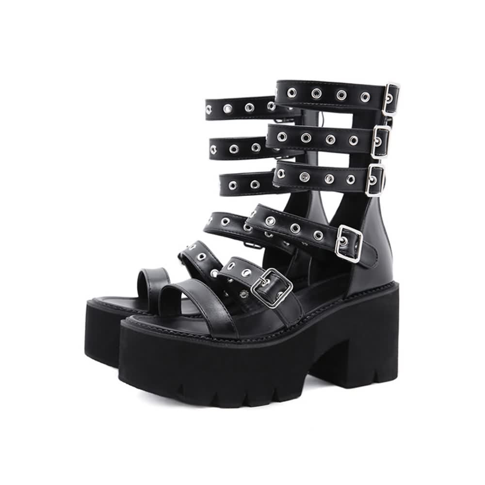 Add a touch of edgy sophistication to your look with our Black Gothic Punk Strappy Platform Sandals. Featuring a chunky platform sole for added height. adjustable buckle closures for a secure fit. and a back zipper closure for easy wear. these sandals combine style and functionality. Made from high-quality black vegan leather. they are perfect for complementing any gothic. punk. rock. or alternative outfit. Step out in style and make a statement with these unique and versatile sandals.