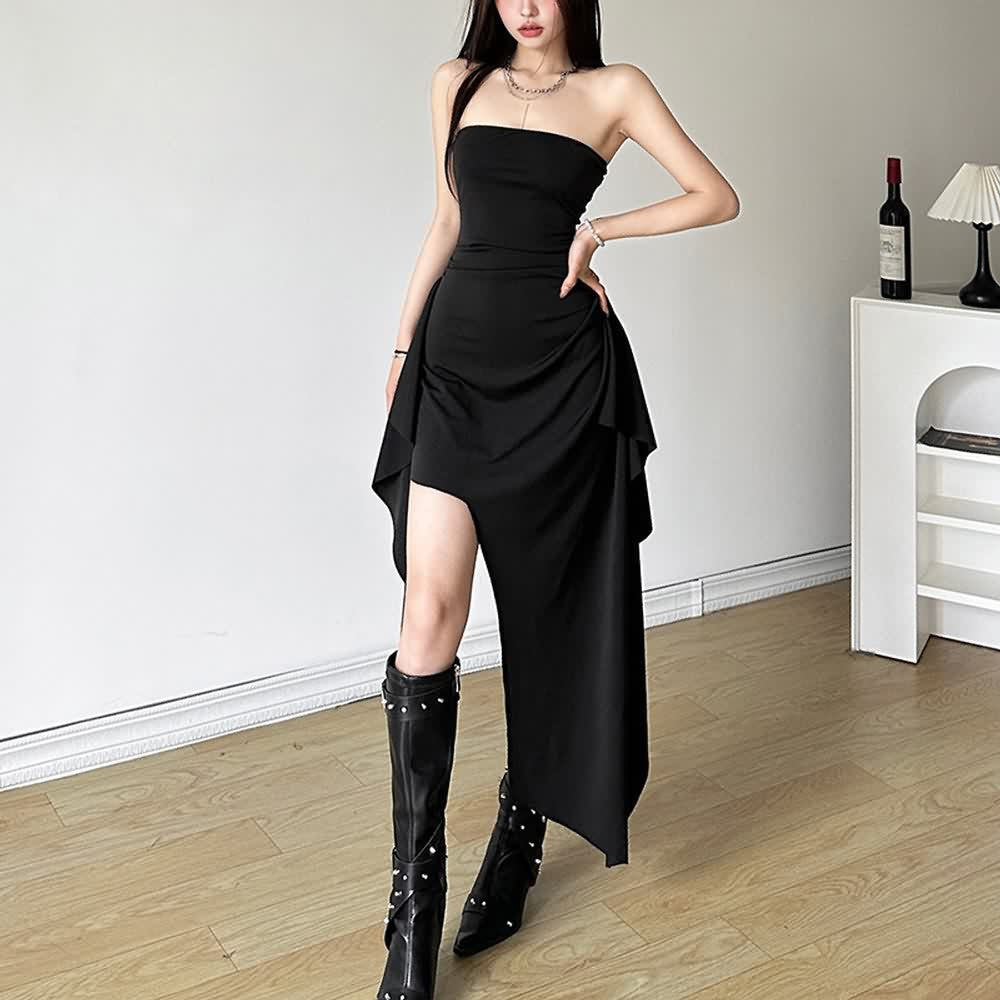 Indulge in luxury with our Black Off The Shoulder Asymmetrical Dress. Showcasing a dramatic off-the-shoulder and asymmetrical design. this midi-length dress exudes sophistication and style. Crafted from black polyester and spandex. it offers both comfort and elegance. making it perfect for those seeking an alternative aesthetic.