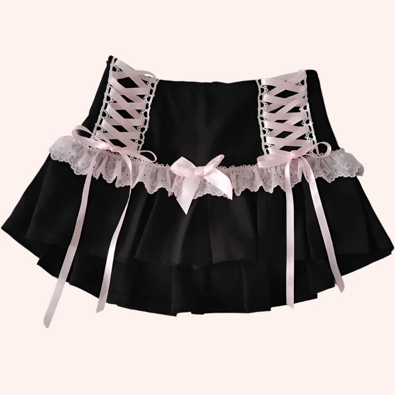This unique handmade fitted coquette mini skirt features pink satin ribbons throughout the sides and lace trim. giving it a flirty and feminine look. Plus. it comes with built-in shorts for added coverage and comfort. Perfect for any occasion! Available in pink and black.