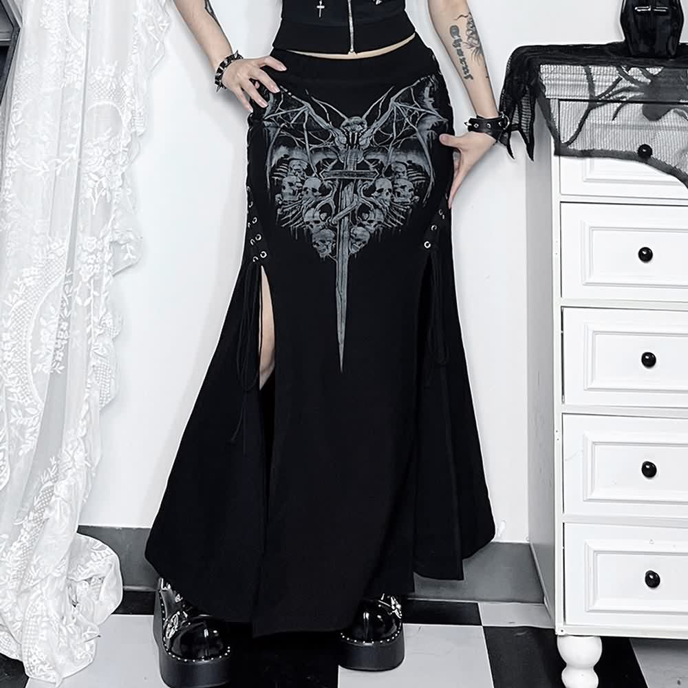 Explore our Gothic Bat Skull Cross Lace Up Slit Maxi Skirt. a striking wardrobe addition. This ankle-length black skirt boasts a high waist. eyelet lace-up detail. and gothic artwork for a touch of elegance. With stylish slits on both sides. it's a must-have for fashion enthusiasts. Elevate your look with this exclusive piece that combines sophistication and bold style.