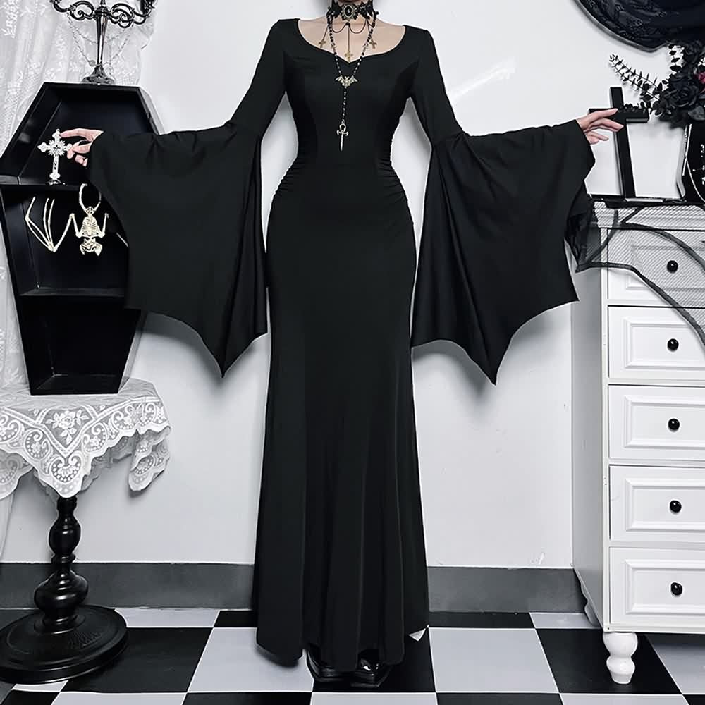 Indulge in alternative aesthetics with our Gothic Bat Sleeve Maxi Dress. inspired by The Addams Family and perfect for Halloween. Featuring elegant long bell sleeves. this dress is crafted from a blend of polyester and spandex. ensuring a flattering drape at ankle length in a sleek black color. Elevate your Halloween or everyday Gothic style with this exclusive. must-have piece.