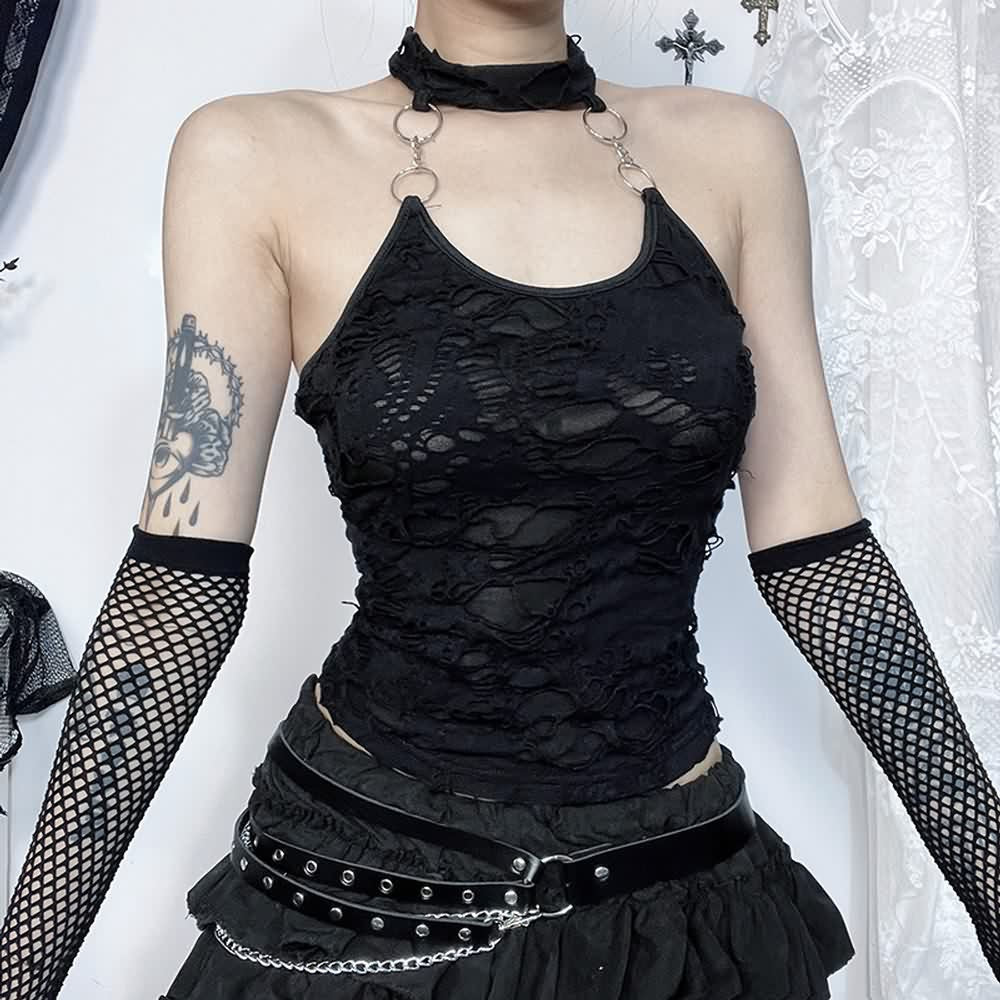 Indulge in the alternative aesthetics of our Gothic Distressed Halter Crop Top. Featuring a halterneck design and a distressed finish. this sleeveless crop top adds a bold. edgy touch to your look. Crafted in classic black. it exudes an exclusive and sophisticated vibe. making it the perfect standout piece for your alternative wardrobe.
