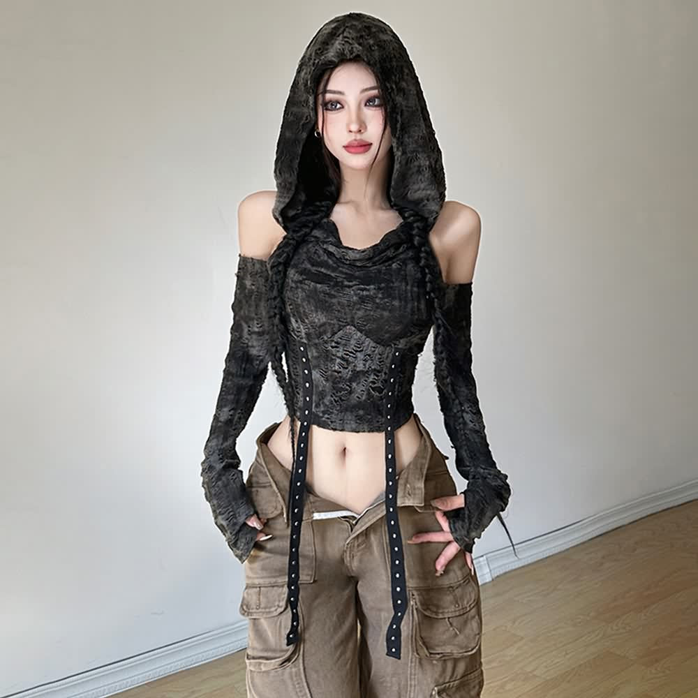 Elevate your style effortlessly with our Gothic Distressed Hooded Long Sleeve Top. This unique top features a stylish distressed detail and a trendy cold shoulder design. perfect for adding edge to any outfit. The open back and cropped length add a touch of allure. while the long sleeves with thumb holes offer both style and practicality. Enhance your wardrobe with this versatile. fashion-forward piece that's sure to make a statement.