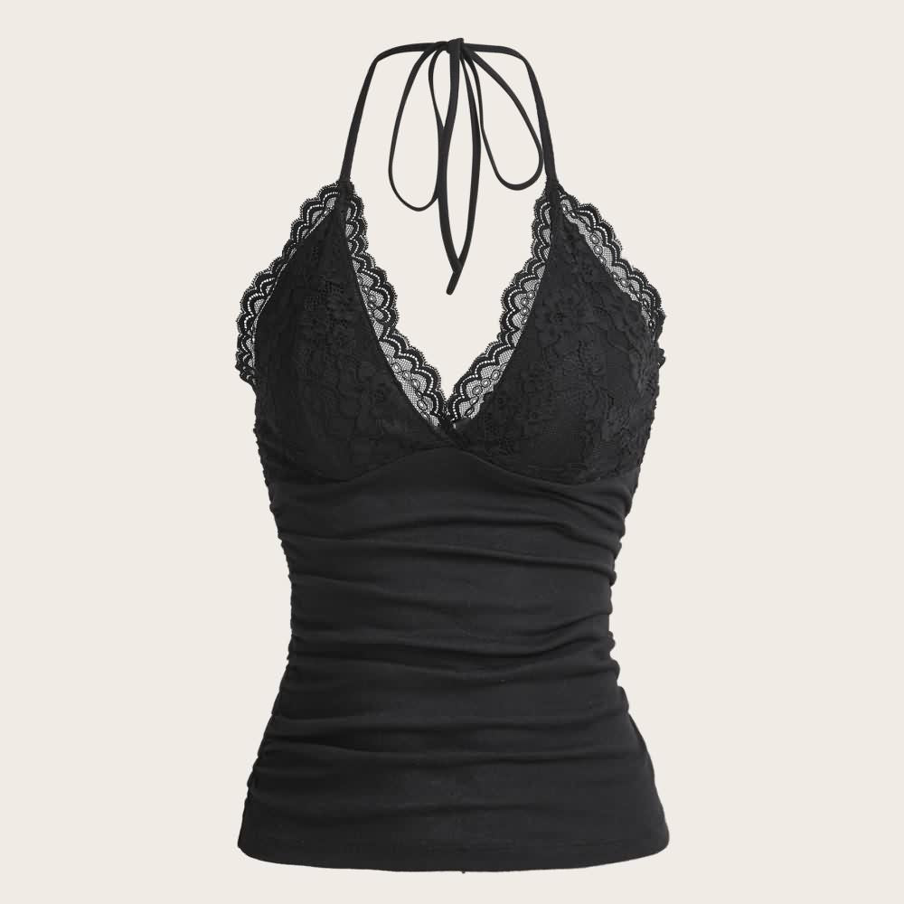 Immerse yourself in the dark allure of our Gothic Lace Halter Crop Top. This sultry top features a deep v-neck and an enticing open back. ideal for evenings out or cozy nights in. Crafted from a premium blend of polyester and spandex. the floral lace detailing adds a sophisticated flair to the chic black design. Elevate your ensemble with this exclusive crop top that exudes style and elegance.
