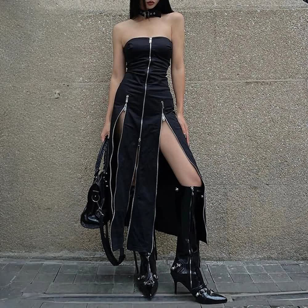 Elevate your style effortlessly with our Gothic Off Shoulder Zip Front Slit Midi Dress. This stylish dress features a central zipper for easy wear. a flattering off-the-shoulder design. and a double slit with zipper detail for a bold look. Made from a blend of polyester and spandex. it offers both comfort and style. Available in timeless black. this dress is a versatile choice for various occasions.