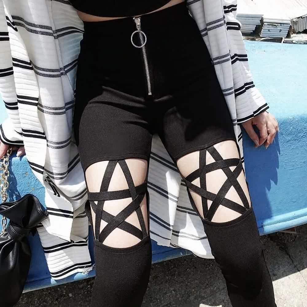 Discover our Gothic Pentagram Leggings - a must-have for a gothic and alluring look. These high-waisted black leggings feature a front zipper and a unique pentagram cut-out design on the thighs. Crafted from a soft and stretchy cotton-polyester blend. they offer both comfort and style. Perfect for any occasion. complete your gothic ensemble effortlessly with these versatile leggings.