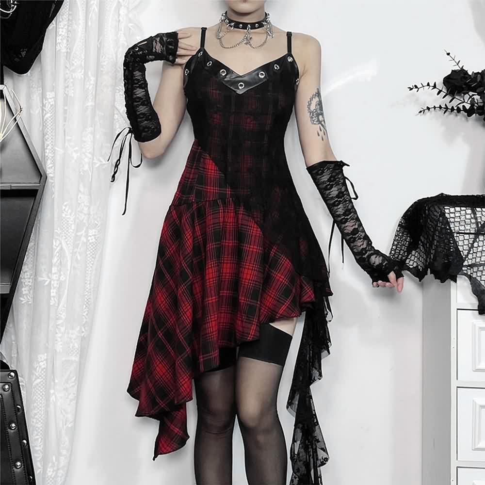 Explore our Gothic Punk Plaid Lace Asymmetrical Dress for a unique style statement. Featuring eyelet leather v-neck. spaghetti straps. and lace overlay. this dress exudes edgy elegance. Stand out with the vibrant red plaid pattern and high-low hem. Embrace your individuality with this must-have piece.