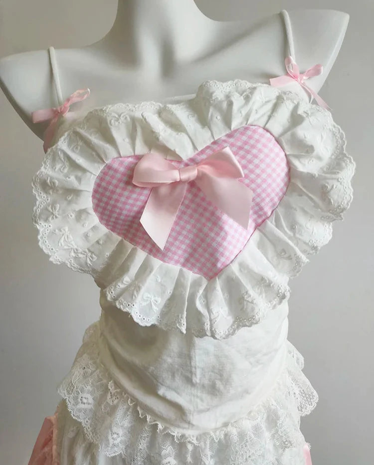 Get ready for love with the Ruffle Heart Bow Coquette Top from ZzKit! This flirty top features ruffle detailing along a heart-shaped design. and a playful bow accent. Perfect for adding some fun to any outfit. this top will make your heart skip a beat (or two!) with its charming design.