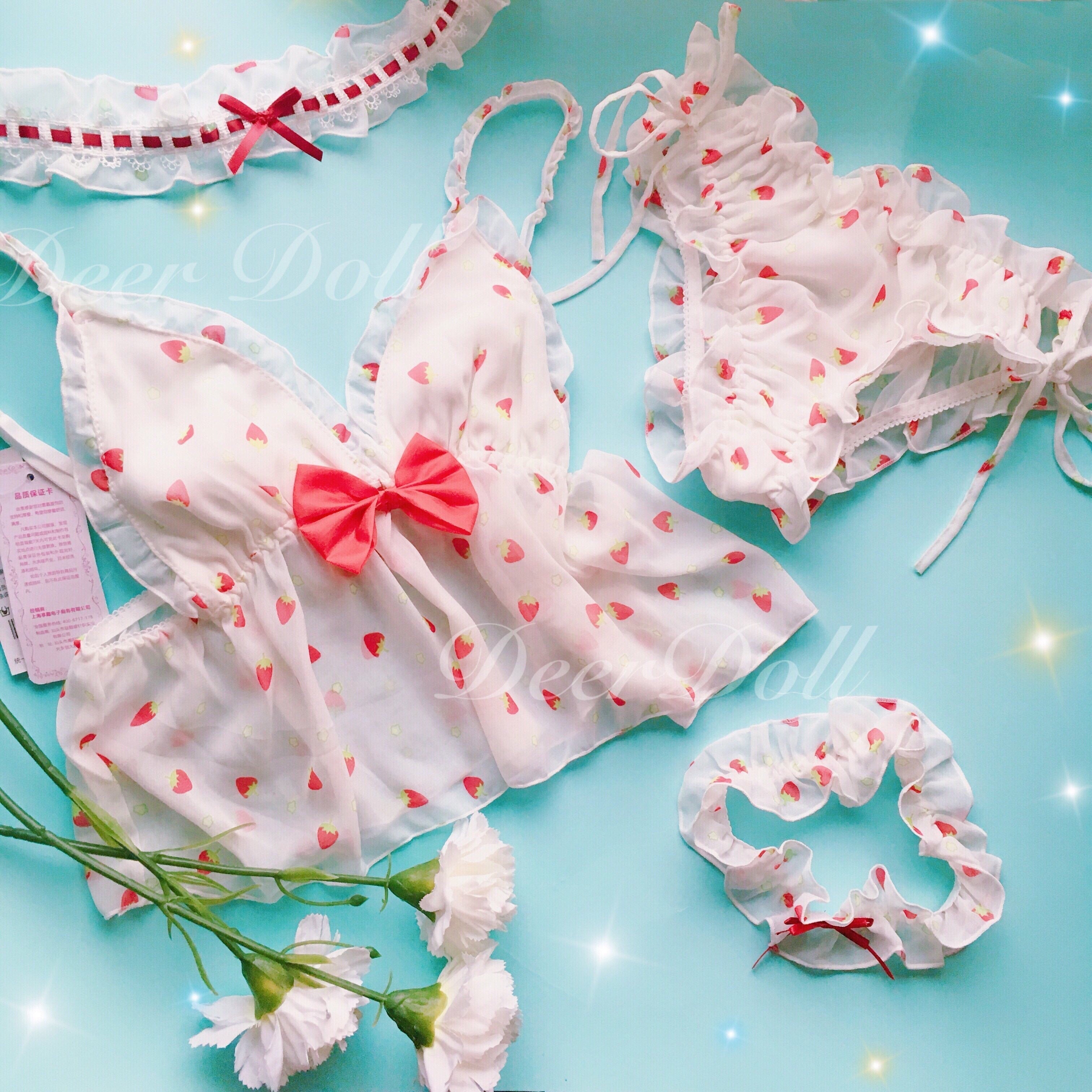 4-piece nymphet style set featuring camisole top with red bow decoration. adjustable bottoms. a matching ribbon choker and garter. The fabric is white. semi-sheer and has strawberries and flower print.