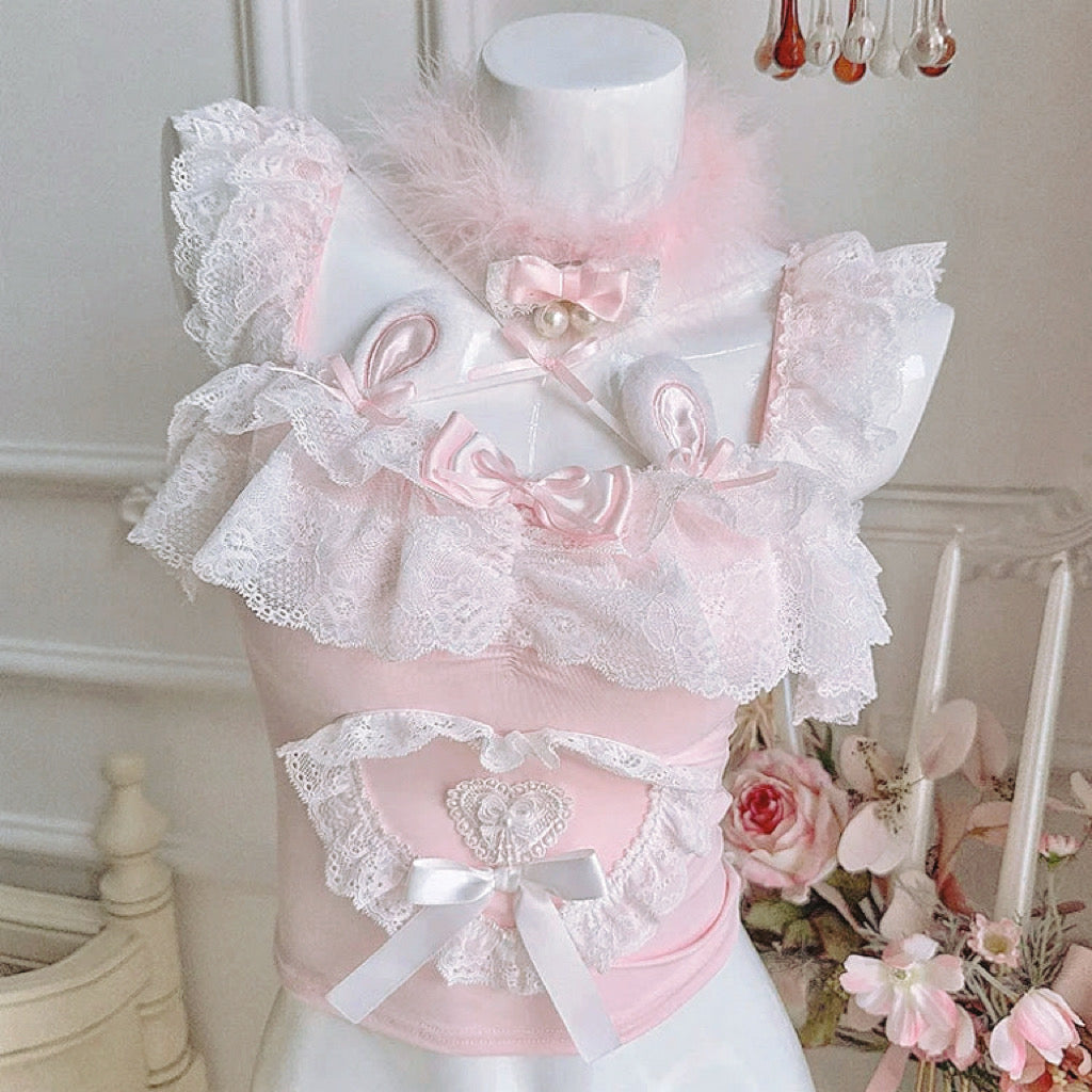 Be a playful and sassy little pink bunny in our Wonder-hop Coquette Bustier Top! With adorable bunny ears accents. satin bows and delicate lace ruffles. you'll add some girly and fun vibes to any outfit. The top is also available for purchase as a 2-piece set with matching white lace bloomers.