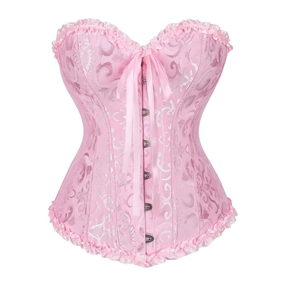 Experience ultimate luxury with our Pink Gothic Ruffle Trim Hourglass Overbust Corset. This corset. featuring an overbust style. eyelet lace-up back. and plastic boning for support. creates a flawless hourglass shape. The delicate ruffle trim adds a touch of elegance. Crafted from high-quality polyester and spandex blend. this corset exudes confidence and glamour. Perfect for those seeking an exclusive and sophisticated look.