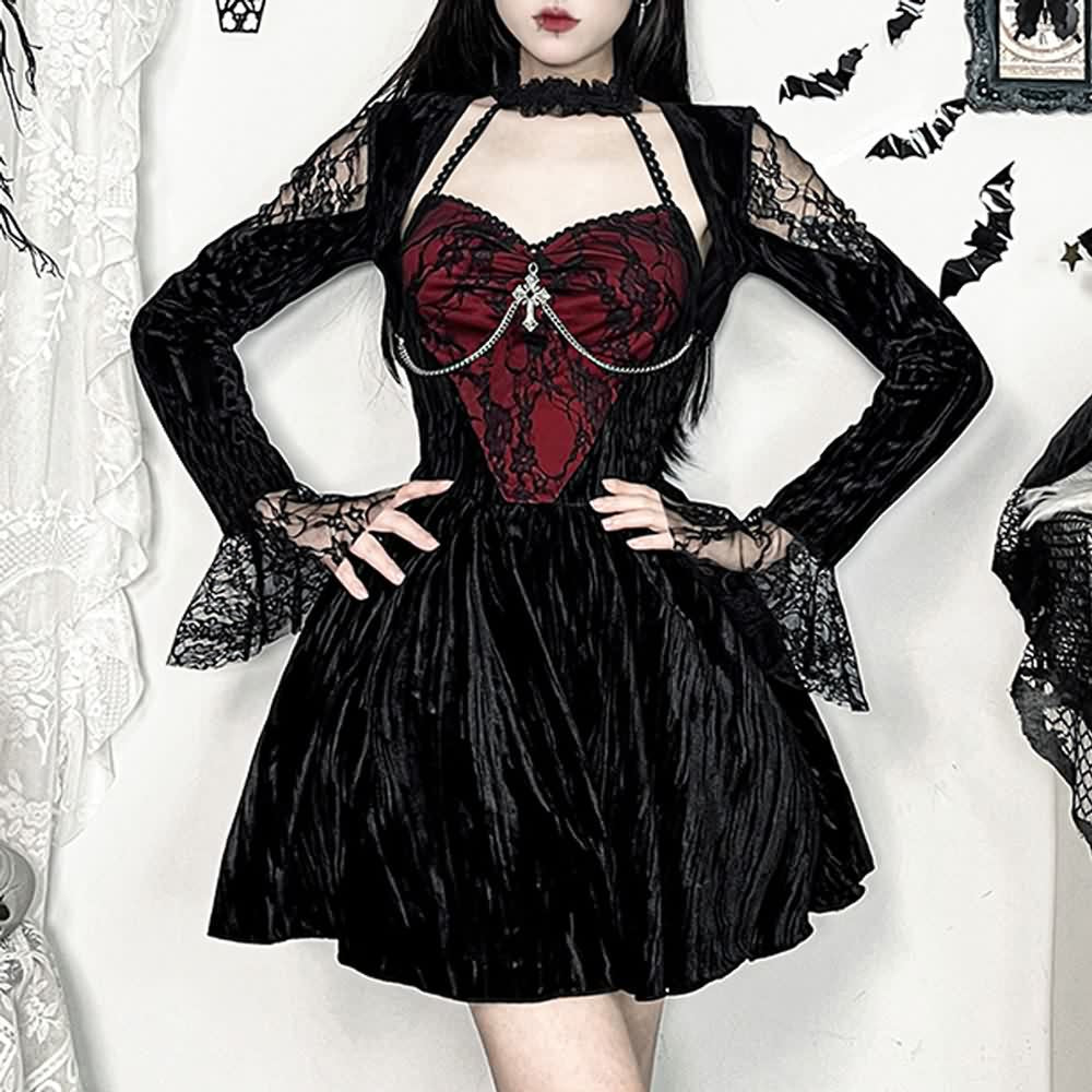 Indulge in luxury with our Red and Black Gothic Long Sleeve Mini Dress. Featuring a halter. square sweetheart neckline. and long flare sleeves. this dress is crafted from plush velvet fabric for a rich. elegant look. Delicate lace detailing and a chain with a cross pendant add a touch of gothic sophistication. making this dress perfect for making a bold statement at any event.