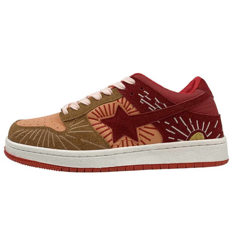 Elevate your streetstyle game with these unique sneakers. The sun and star embroidery in vibrant red adds a touch of energy and charm to your outfit. making these sneakers a must-have for those who appreciate streetstyle aesthetics. Crafted from soft suede velvet. they offer a luxurious touch and ultimate comfort for all-day wear.