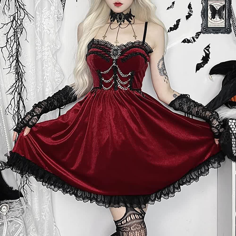 Indulge in luxury with our Red Velvet Vampire Gothic Lolita Mini Dress. Designed with delicate spaghetti straps. a sweetheart neckline. and intricate lace trim. this dress exudes timeless elegance. The pearl pendant and chain details add a touch of sophistication. while the A-line cut and empire waist create a flattering silhouette. Crafted from sumptuous red velvet. this dress is perfect for any formal occasion. making it an essential piece for gothic and Lolita fashion lovers.
