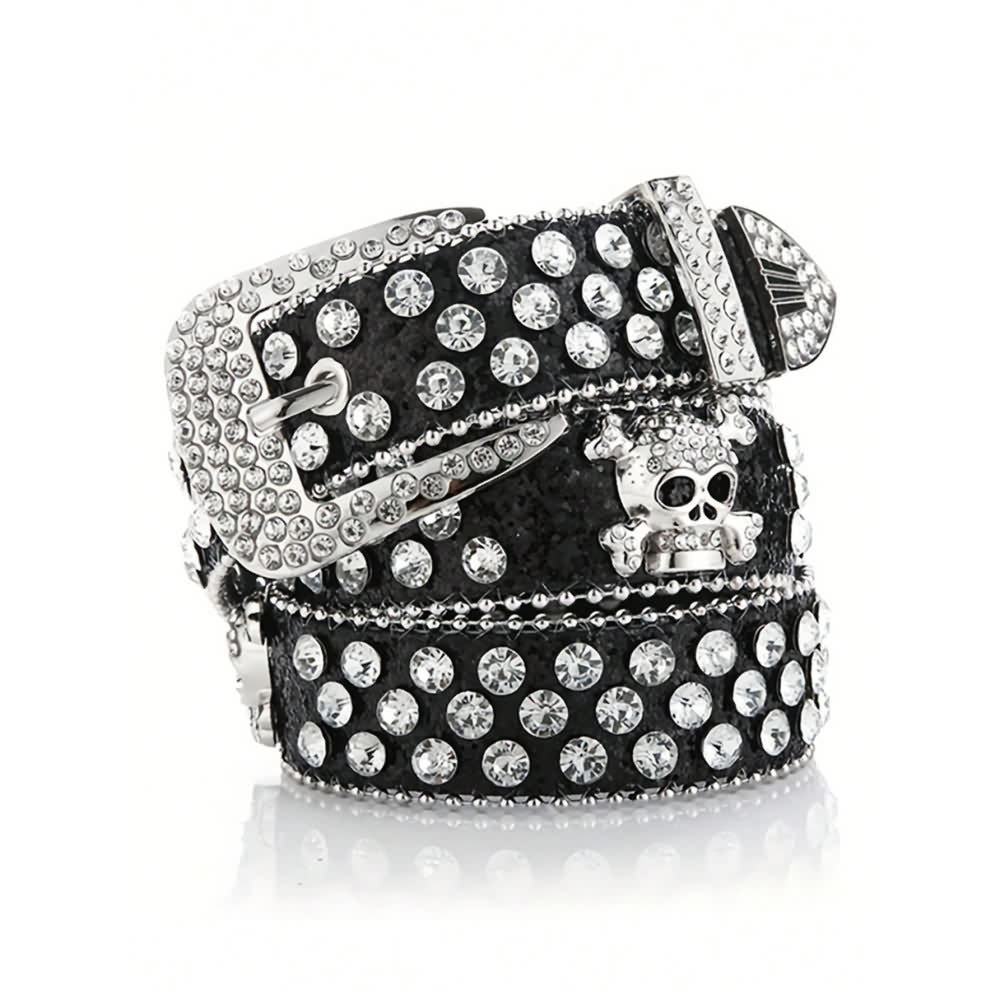 Upgrade your look with our Rhinestone Gothic Punk Rock Skull Buckle Belt. Designed with rhinestone rivet accents. skull and crossbone motifs. and crafted from black PU leather. this belt radiates a bold and rebellious allure. Ideal for punk rock and alternative fashion enthusiasts. it serves as the perfect accessory to enhance any ensemble with a hint of glamour.