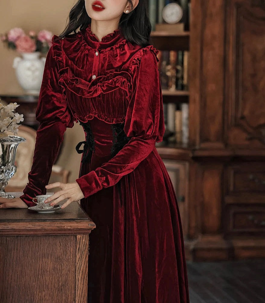 Step into timeless elegance with Ruby Victorian-Vintage-inspired Deep-Red Velvet Shirt from ZzKit. Soft. romantic rich dark deep burgundy-red velvet fabric supplies a luxurious feel and stunning visual. perfect for an afternoon tea or the holiday party. A beautiful Victorian-vintage-aesthetic velvet shirt with pearl buttons and ruffles that can be paired with the matching Ruby velvet dress available here