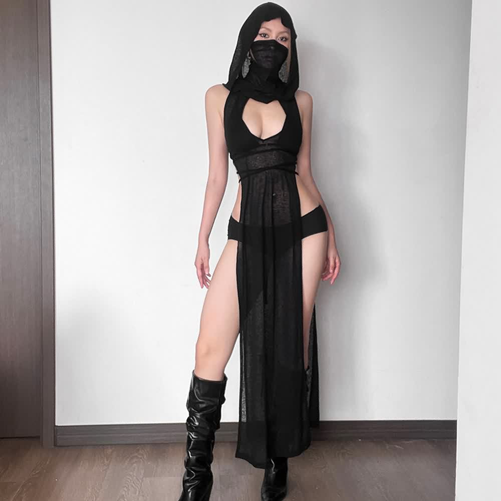 Experience an alternative aesthetic with our Sexy Black Gothic Keyhole Hooded Maxi Tank Dress. Crafted from semi-sheer ribbed knit fabric. this striking dress features a hooded design with a cowl neckline that can double as a mask for added mystery. The keyhole front plunging neckline and high side slits add a seductive touch. making this versatile black dress perfect for gothic. cosplay. festival. and club events.