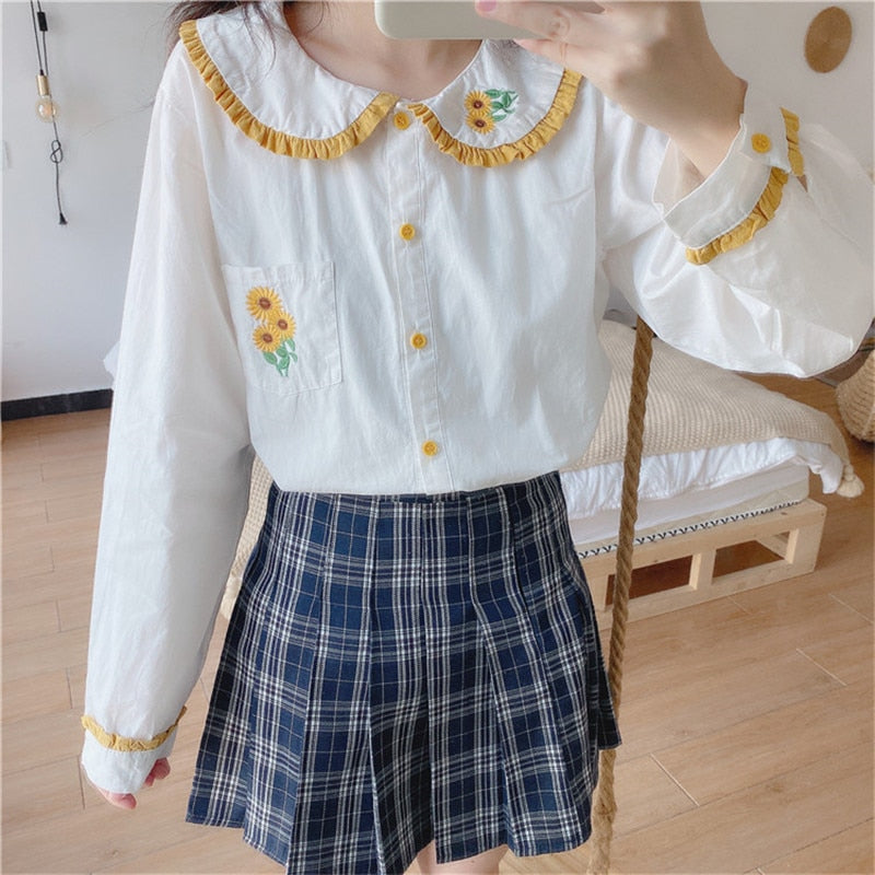 Sunflower Embroidered Mori Kawaii Girl Long Sleeve Lolita Shirt with Peter pan Collar