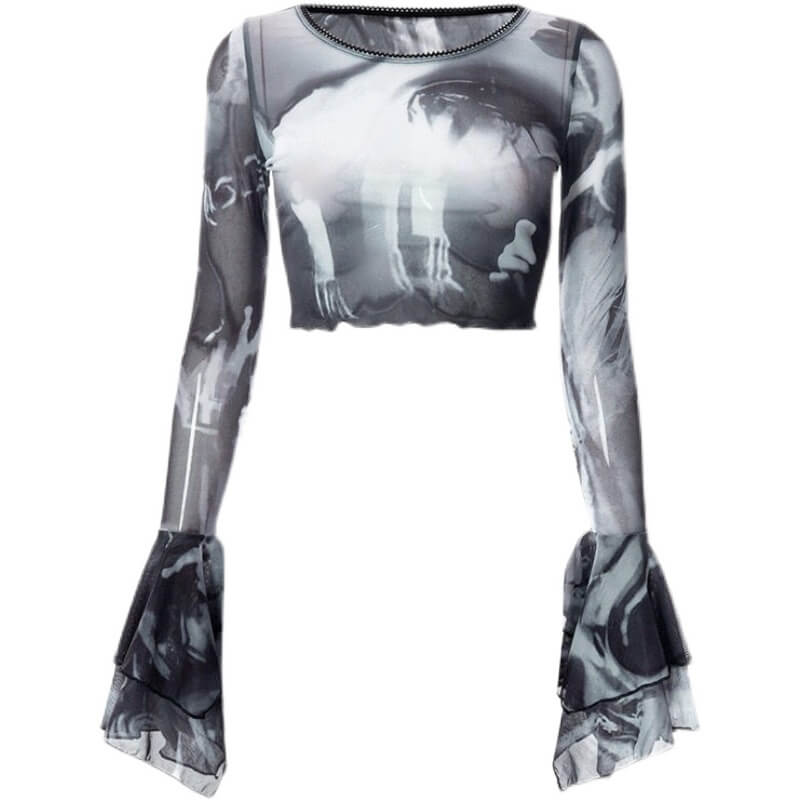 Indulge in the mystical allure of the Witch Clothing Aesthetic Flared Sleeves Mesh Top. Free shipping in the US and worldwide. In the enchanting shade of gray. this mesh top is not just clothing; it's a statement of your dark aesthetic. perfect for the E-Girl who embraces the witchy vibes of goth fashion.